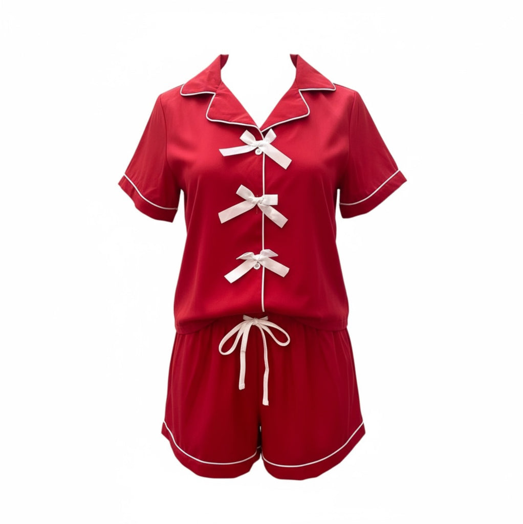 A Cute, Feminine sleepwear set with bow accents on front of top. Button down top with tie on shorts