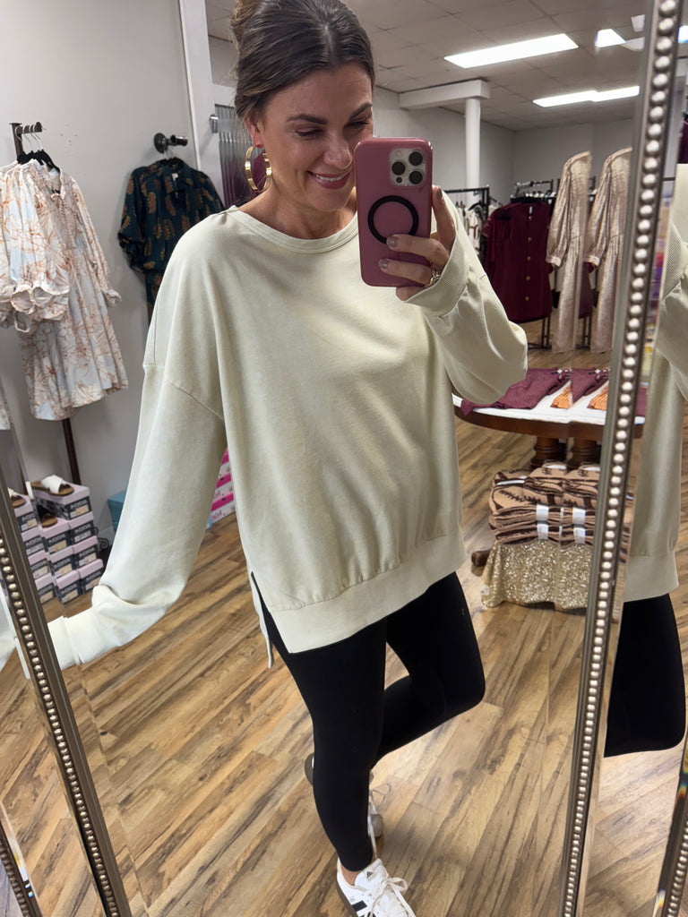 Round Neckline long sleeves with drop shoulder and side hem split.